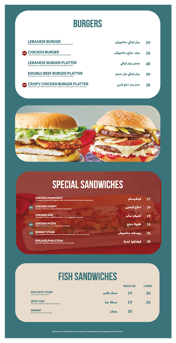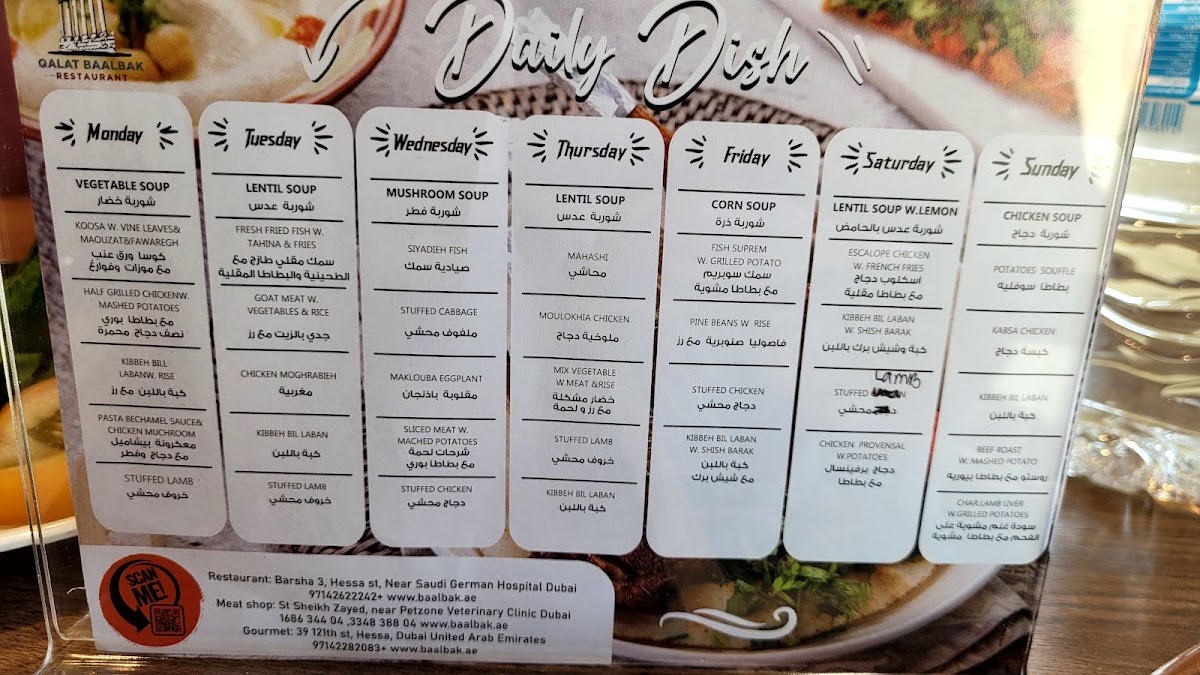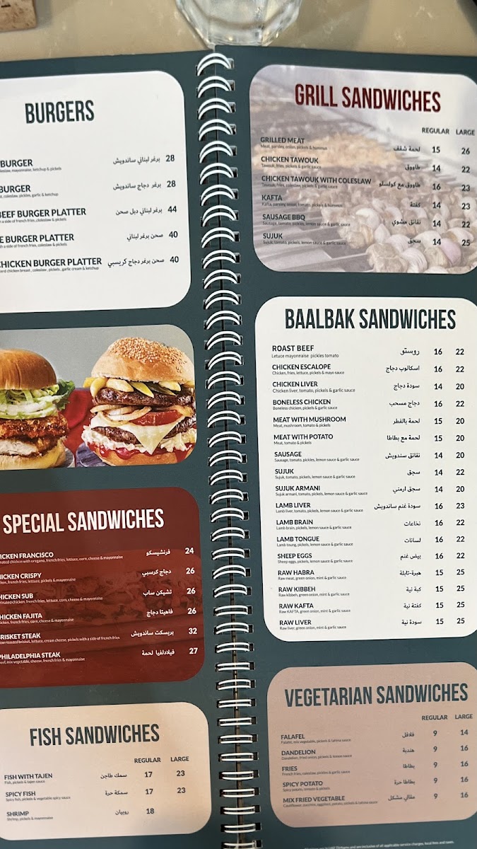 Qalat Baalbak Restaurant in Al Barsha, Dubai, offers an authentic Lebanese culinary journey that celebrates fresh ingredients and vibrant flavors. The menu showcases a variety of classic Middle Eastern dishes, from hearty Chicken Tawouk Sandwiches served with fries and garlic sauce to the uniquely spiced Sujuk Shawarma, layered with pickles and special sauces in warm Arabic bread. Their Beef Shawarma Plate stands out for its perfect blend of tender beef, fresh onions, parsley, and creamy tahini, delivering a balanced and satisfying experience.